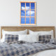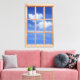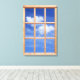 3 Dimensional Canvas Window Scene - Clouds It can always be summer with this window picture showing blue sky outside, with fluffy white clouds floating in the sky. This photographic print is on stretched canvas mounted over a wood frame, giving it a depth of 1.5 inches for a real 3d effect. The wooden window frame that appears in the picture has been placed to create a fake window look when you hang it on your wall. Have a relaxing view to gaze at no matter what the weather is like outside!