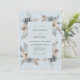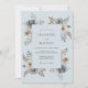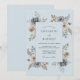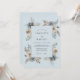 This design evokes a serene and romantic mood with its soft sky blue background and a delicate arrangement of muted floral elements. Elegant depictions of roses and feathery foliage in shades of grey, taupe, and soft brown create a timeless and graceful aesthetic. Perfect for a sophisticated affair.