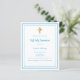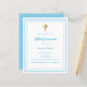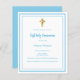 A white background, decorated with a sky blue frame, and a golden cross Personalise and add the name and details. Blue text.