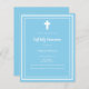 A sky blue background, decorated with a white frame, and a white cross Personalise and add the name and details. White text.