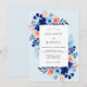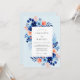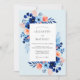 A soft sky blue background sets a tranquil stage for this vibrant watercolor design. Deep navy blue anemones and delicate peach blossoms create a striking contrast, complemented by an array of azure petals and airy green leaves. The botanical arrangement evokes a fresh seaside atmosphere, making it ideal for a romantic coastal or spring event.