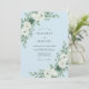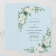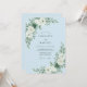 This design features a soothing sky blue background decorated with elegant botanical arrangements. Lush white roses are paired with dusty green eucalyptus and textured succulent accents for a serene, organic aesthetic. The cool-toned palette creates a sophisticated atmosphere suitable for a seasonal winter or spring event.