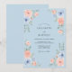 This design showcases a tranquil sky blue palette adorned with soft watercolor roses in shades of peach and periwinkle. Delicate eucalyptus leaves and lush greenery accent the corners, creating a romantic botanical aesthetic. The ethereal hand-painted style is ideal for a graceful spring or summer event.