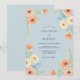 This design features a soft wash of sky blue as a backdrop for delicate watercolor blooms. Vibrant peach poppies and buttery yellow anemones are clustered at the corners, intertwined with sprigs of sage green eucalyptus. The composition evokes an airy and romantic atmosphere, perfect for a springtime botanical theme. Subtle blue wildflowers and soft greenery add natural beauty to the aesthetic.