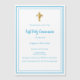 A white background, decorated with a sky blue frame, and a golden cross Personalise and add the name and details. Blue text.