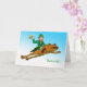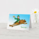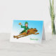 Sláinte! (Cheers!) wishes for St. Patrick's Day. A leprechaun is riding on a frog through the sky as he holds a mug of foamy beer. He spreads cheer, good wishes, and HOPpiness as he glides through the air. The leprechaun is dressed in a green suit, hat with shamrock, and stockings with green stripes. Art, image, and verse copyright © Shoaff Ballanger Studios, 2024.