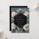 This opulent design evokes a moody, romantic atmosphere with deep slate blue and cream roses. Lush, dark foliage surrounds the blooms, creating a dramatic and elegant visual. The intricate floral arrangement suggests a sophisticated, artistic theme.