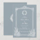 Set a refined and romantic tone for your special day with this elegant dusty blue vintage ornate frame wedding invitation, featuring a delicate white line-art botanical border, a sophisticated decorative frame, and a custom monogram at the centre. This timeless design blends classic wedding elegance with a touch of French country charm, making it the perfect introduction to your wedding celebration.