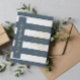 Chic typography wedding invitation in slate blue, white, and gold with stripes and a modern typography design. Modern typography wedding invitation with slate blue and white stripes, and gold foil text.