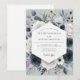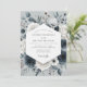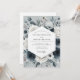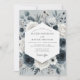 A dramatic and sophisticated floral arrangement showcases deep slate blue and soft ivory blooms against a muted grey backdrop. The moody atmosphere evokes a sense of romantic enchantment, perfect for an elegant affair. Delicate botanicals intertwine with lush rose-like blossoms, creating a captivating visual story.