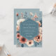 An elegant and artistic composition features a lush arrangement of blossoms against a serene, dusty blue backdrop. Soft, painterly flowers in shades of warm coral, delicate peach, and creamy ivory create a stunning, romantic contrast. Beautifully rendered anemones and roses are nestled amongst sprays of delicate greenery, evoking a timeless appeal for your nuptials.