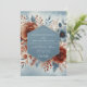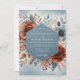 Set a tone of artistic elegance for your special day with this stunning design. A beautiful arrangement of lush terracotta poppies and dusty blue blooms is rendered in a soft watercolor style. Delicate sprigs of foliage in complementary shades create a romantic, botanical composition against a pale blue wash, perfect for a sophisticated autumn or winter union.