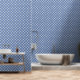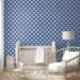 Cute wallpaper is slate blue with a diagonal pattern of white daisies. It's available in either smooth vinyl or textured vinyl and in a variety of sizes.  The wallpapers vinyl surface allows for easy cleaning and maintenance, which makes it perfect for high traffic areas.