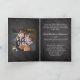 Slate chalkboard-look wedding invitation folded cards from matching set features dark charcoal grey background with slate blackboard effect, and white chalk handwritten drawing look writing in the foreground. Decorative swirl motif adds a touch of casual elegance. All Designs Copyright © 2013 www.CustomInvitesOnline.com