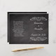 Slate chalkboard-look wedding program matching set features dark charcoal grey background with slate blackboard effect, and white chalk handwritten drawing look writing in the foreground. Decorative swirl motif adds a touch of casual elegance. All Designs Copyright © 2013 www.CustomInvitesOnline.com