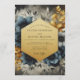 Experience a dramatic and artistic atmosphere for your nuptials. This elegant design features lush, slate blue anemones and golden marigold foliage set against a dark, smoky backdrop. The painterly style creates a moody and sophisticated aesthetic, perfect for a memorable autumn or winter union.