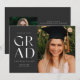 Celebrate your graduation in style with this modern graduation announcement and invitation. It features the word GRAD in stylish sans serif on a dark slate coloured background on the front, along with space for a photo. The back of the invitation has space for a second photo as well as room for all of the details of your graduation party.