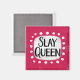A fun and cute typographic design that says "Slay Queen". It's black text on a white rectangle with funky, playful white dots surrounding it, all on a hot pink magenta background.