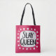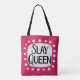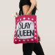 A fun and cute typographic design that says "Slay Queen". It's black text on a white rectangle with funky, playful white dots surrounding it, all on a hot pink magenta background.