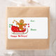 This Christmas gift tag label features a cute image of a decorated Gingerbread man in a red sled. Beside him are various coloured, striped candy canes. The text underneath the image says "Happy Holidays" in red, and at the side is "For" and "From" in green. All the text is easily customised by you. Fun, especially for kids!