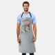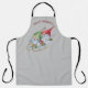 Whimsical Holiday themed apron features watercolor illustration of a pair of gnomes on a fast moving sled. Grey background with customisable text in modern dark red font.