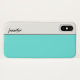 A no fuss sleek modern design with a split tone colour block background in beautiful robin's egg blue and off-white divided by a thin black line border. This case is personalised with a trendy script type face that you can edit with your desired name or other text.