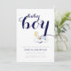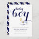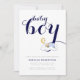 Sleeping baby boy shower elegant navy blue typography minimal invitation featuring the text baby boy in blue on white background and a baby boy in light blue clothes sleeping on a cloud and the yellow crescent moon. Text in grey. The back includes a baby boy pattern. You can change background colour. Some elements by Trina Clark.