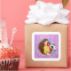 The picture printed on this item was created from a painting called The Shared Dream, the artwork is of a lady who is curled up asleep next to a sleeping black and white cat. There are various images around the pair to symbolise their dream. The lady is wearing a yellow patterned dress and she has long brown hair. The area surrounding the woman and the cat is in a light purple colour with images in a lighter colour including animals and plants. This art is a nice bright and colourful picture. The image featured is used with kind permission from Flying Fish Artists.