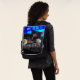The original artwork by ZoeSPEAK on this Backpack is an original photograph of a cat sleeping in front of a television. The cat is a calico, with white paws coming towards the camera. A program about finance is on TV, with a bright blue graphic including the words "VENTURE CAPITAL FUNDING". Under the cat, showing her interest in financial matters, are the words "VENTURE CATIPALIST", in text with a cat fur pattern and a blue glow behind it, like the blue glow behind the cat's fur at its edges.