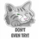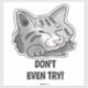An image of a funny grey cat with a pink nose and green eyes. The pet is half-sleeping, half keeping an observant eye on a stranger. Don't Even Try! customisable text under the image. You can change or delete the text. Please, use the "Edit Design" option to change the colour, size, and type of the font. Be creative, customise and buy one, and be happy.