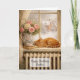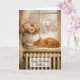 A peaceful ginger cat sleeping on a windowsill beside soft flowers, with a snowy winter landscape outside. Warm tones and gentle light create a cosy seasonal atmosphere.
