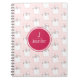 A spiral notebook with a custom name and monogram initial inside a pinkish red circle. Designed with a cute pattern of sleeping kitty cats all around looking peaceful and happy. Pink background.
