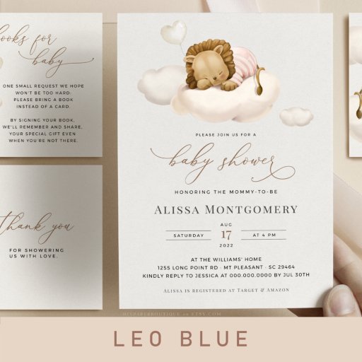 A little lion is sleeping on a cloud. Whimsical hand-painted watercolors and modern typography compliment my design. Personalise this cute Lion Baby Shower item with your baby shower details easily and quickly, press the customise it button to further re-arrange, and format the style and placement of the text.