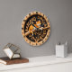 Invite the warmth of nature into your home with this charming wall clock featuring a high-definition image of a sleeping orange tabby cat. The peaceful feline is depicted napping atop a rustic branch, surrounded by a graceful arrangement of carved-style leaves that create a beautiful autumnal aesthetic. Set against a dark, vertically-planked wood-textured center, the vibrant orange and white fur of the cat creates a striking focal point. The outer rim features a light wood grain print with bold black numbers and delicate leaf accents at the hour markers for easy reading. While the artwork offers a rich, layered 3D-style depth, the clock itself is a lightweight and durable graphic timepiece. This high-energy design is perfect for adding a cozy, sophisticated touch to a living room, hallway, or study, celebrating the quiet beauty of a resting pet.