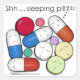 An image of a cute colourful bunch of pills or medication with sleeping faces on them. The caption above reads, "Shh ... sleeping pillzzz". Would be great to use in a bedroom, doctor’s office, psychologist’s office, or anywhere pills would be sold or used. Funny pun illustration created by Christie Black of Creations from the Heart.
