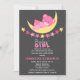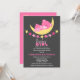 © Socialite Designs. Cute pink teddy bear sleeping on the moon baby shower invitation for a baby girl. The design also has a star banner and "baby girl" text hanging from the banner. The back of the invitation has a pink background with yellow stars. All design elements can be moved, resized or deleted to suit your event.