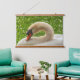 A close-up photograph captures a mute swan in a serene moment of slumbering. Its head is bent down, its orange beak gently cleaning its soft, white feathers. The swan's black eyes are closed, suggesting a state of relaxation. The background is a blur of green grass and white flowers, creating a peaceful and natural setting.
