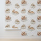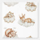 Perfect for a baby nursery, this wallpaper has repeating images of little woodland animals enjoying their sleep on fluffy white clouds. Animals included are owls, squirrels, and antlered deer, in neutral tones of brown and tan. Everything is placed on a white background.