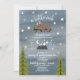 A baby shower invitation featuring an illustration of a baby bear lounging on a tree branch surrounded by stars. Mountain illustration and trees at bottom. Personalise the text. Background is dark blue watercolor inspired. Bear is wearing a flower crown.