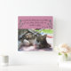 This wall clock shows a sleepy tabby cat with a freckled pink nose, white paws and white chest. Along with this adorable cat is the Bible verse Psalm 4:8 which says, "In peace I will lie down and sleep, for you alone, Lord, make me dwell in safety." A beautiful wall clock for every cat lover.