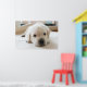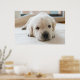 Closeup image of a tired 2 weeks old labrador retriever puppy lying down on a white carpet and looking at camera
