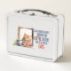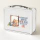 This is a standard metal lunchbox that appears to work just fine. We designed this box ourselves with an uploaded photo and custom text on the front and back. It looks absolutely beautiful except the front of the lunchbox is not centered like it shows in the photo. The print borders don't align with the inset flat part of the box where the preview photo online showed it perfectly centered in there. The back looks nice and centered though.
