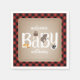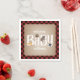 Baby shower napkins featuring an illustration of a fox, owl, bear, and racoon resting on "BABY' text. Background is brown cardstock inspired with a red and black buffalo plaid border. Personalise the name.