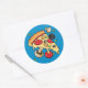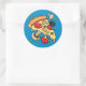 Colourful pop art style slice of pizza with pepperoni, mushrooms, green pepper and olive toppings.