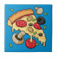 Colorful pop art style slice of pizza with pepperoni, mushrooms, green pepper and olive toppings.