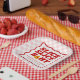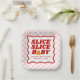Serve up a slice of fun with these “Slice, Slice, Baby” baby shower paper plates. The design features a red wavy border framing a soft pink checkerboard background, creating a playful yet polished look. “Slice Slice Baby” appears in bold red lettering, with a slice of pizza forming the letter “A” and detailed with heart-shaped pepperoni for a whimsical touch. Personalized text below allows you to include the mom-to-be’s name and baby shower date. Perfect for desserts, snacks, and party bites, these paper plates coordinate beautifully with a pizza-themed baby shower celebrating a baby girl.