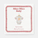 "slice slice baby" pizza themed baby shower featuring illustration of a baby bodysuit with red striped sleeves and illustration of pizza at centre. Border is hand drawn red chequerboard design with rounded corners.