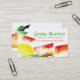 Watercolor style sliced vegetables with lemon and herbs on this colourful business card for a vegan chef, catering company, produce or farmers market vendor and other food, cooking, or culinary business.