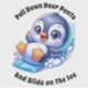 This adorable penguin illustration features a cute penguin joyfully sliding down the ice with the bold, tongue-in-cheek phrase “Pull Down Your Pants and Slide on the Ice”