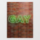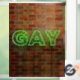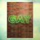 SlipperyJoe illuminated gay neon sign bright vivid electric green lights letters mounted reddish-brown brick wall gay pride gifts identity celebration LGBTQIA urban industrial look celebration love identity community live your truth visibility power vibrant glow contrasts textured backdrop sleek electric curves artistic casting lively aura